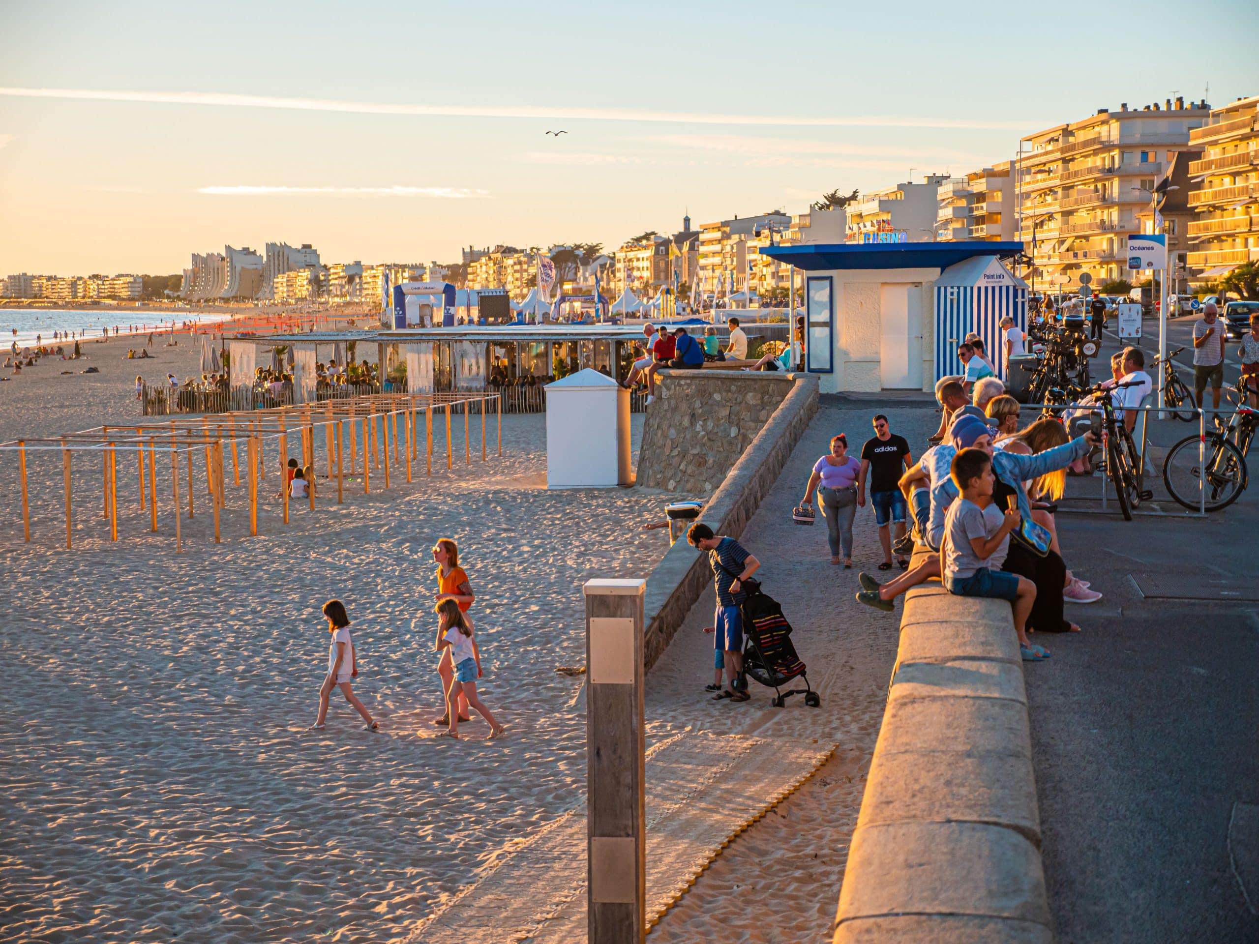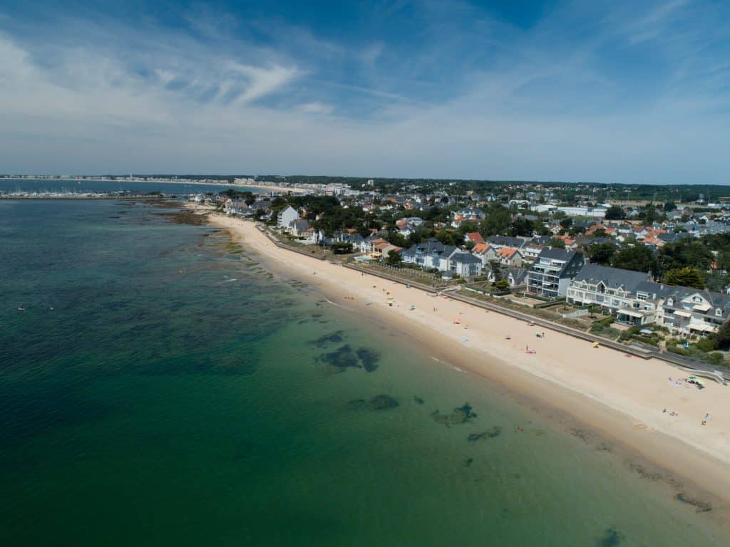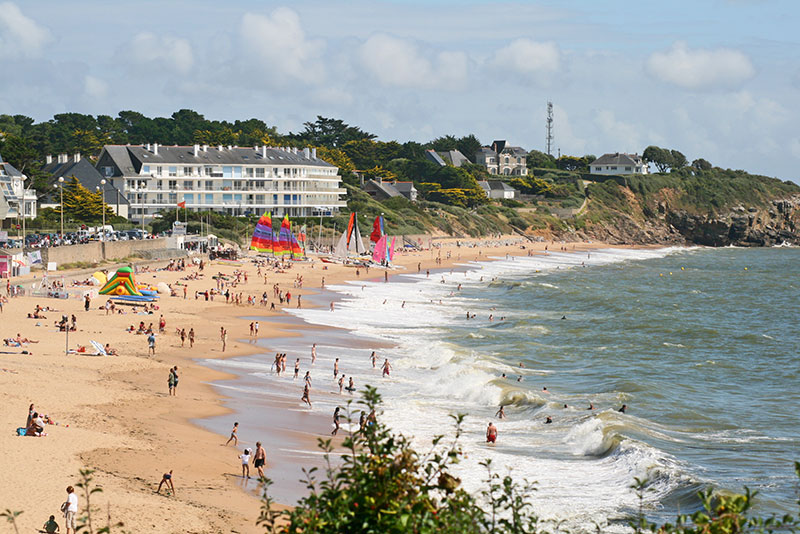 Ses 2 km de sable blond et sa faible pente en font la plage des familles par excellence. Orientée sud/ouest avec un panorama à 180° sur l’une des plus belles baies du monde, l’océan Atlantique, du port de plaisance à la pointe découpée de Penchâteau (Pouliguen). C’est aussi avec ses 6 chenaux, le point de départ d’aventures maritimes. Bordant la plage, une longue promenade est propice aux joggings matinaux, aux balades en poussette et flâneries au coucher du soleil.